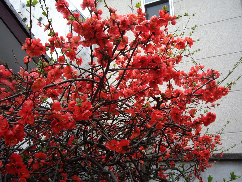 近所の庭先で、ボケ満開~~